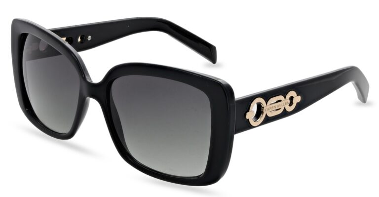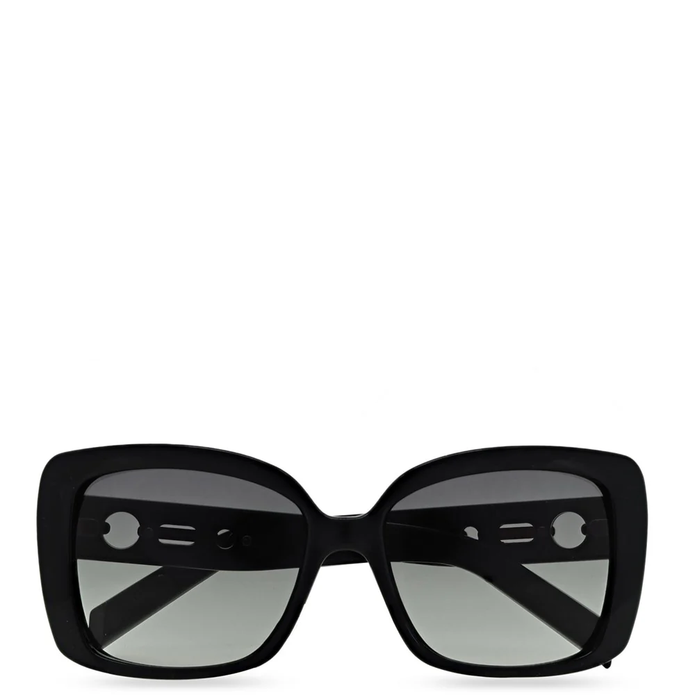 This glamorous pair of Butterfly Sunglasses in a Black Acetate Frame with Grey Gradient Polycarbonate lens are complemented by beautiful gold tone hardware decoration on each temple and engraved with the Karen Millen name.