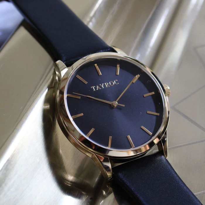 TAYROC TY375  Lid Gold wristwatch features a classic black and gold face with baton markers and a genuine leather black strap, perfect for making a statement. The high-quality leather adds a touch of luxury and sophistication, while the distinctive face ensures you’ll never miss a beat.